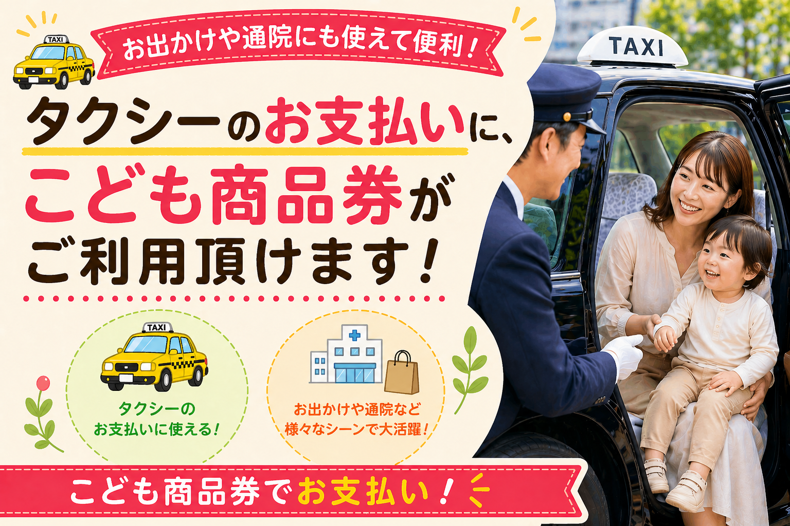 こども商品券タクシーのお支払いに、こども商品券がご利用頂けます!2021.9.30
